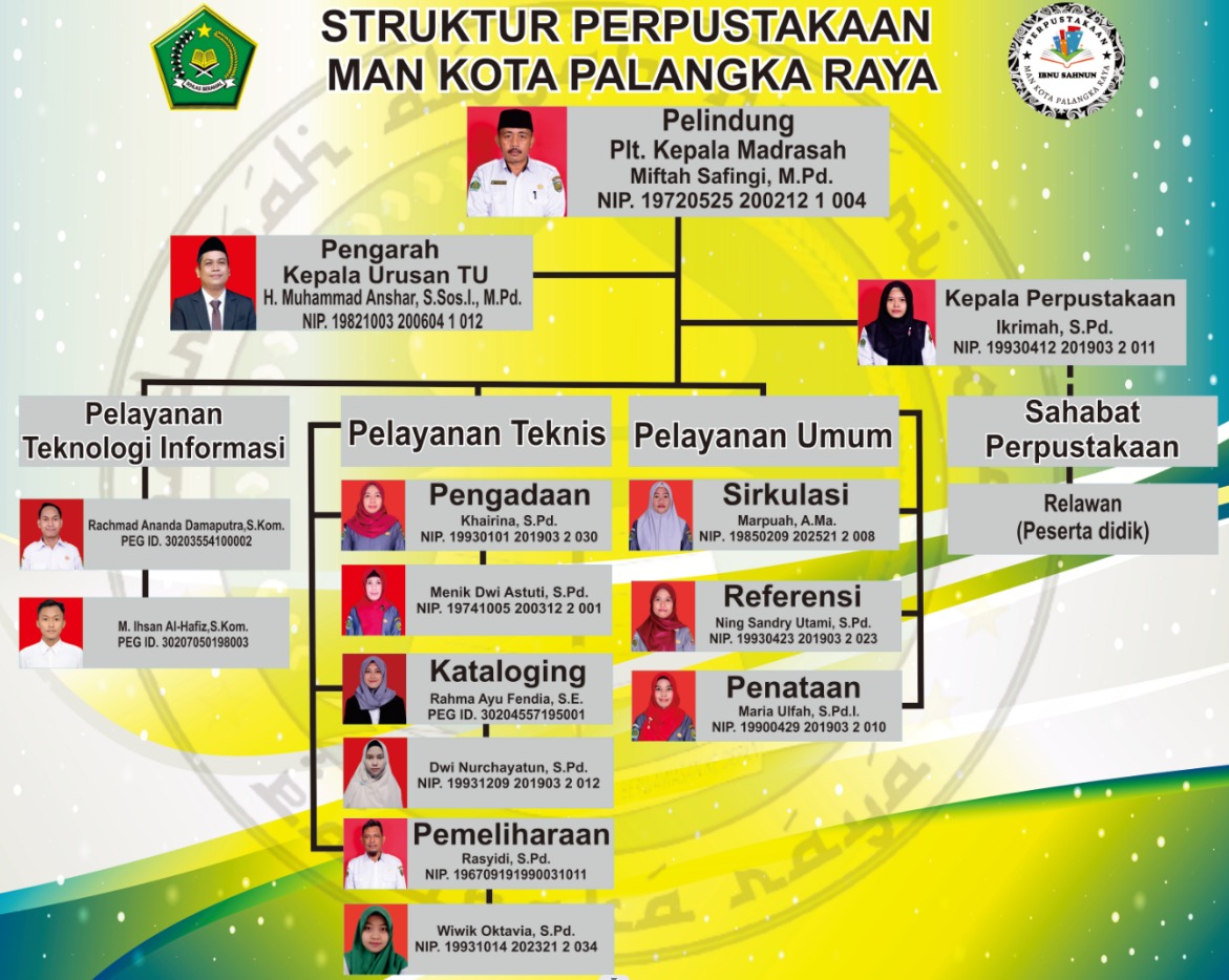 Perpustakaan MAN Kota Palangka Raya berdiri seiring dengan berdirinya relokasi dari MAN II Yogyakarta di Jalan S. Parman Kompleks Masjid Jami Annur dengan Keputusan Menteri Agama Nomor 27 Tahun 1980, tanggal 05 Mei 1980, kemudian MAN Kota Palangka Raya pada tanggal 27 Mei 1982 pindah ke bangunan sendiri yang beralamat jalan Tjilik Riwut km. 4,5 Palangka Raya. Seiring dengan kemajuan pendidikan, pada tanggal 28 Pebruari 1998 sesuai dengan Keputusan Direktur Jenderal Pembinaan Kelembagaan Agama Islam Nomor : E.IV/PP.00.6/KEP/17.A/1998 berubah nama menjadi MAN Model Palangka Raya. Selanjutnya berubah kembali berdasarkan Keputusan Dirjen Pendis Kemenag RI No. 72 Tahun 2016, tanggal 17 November 2016 tentang Perubahan MAN Model Palangka Raya menjadi MAN Kota Palangka Raya